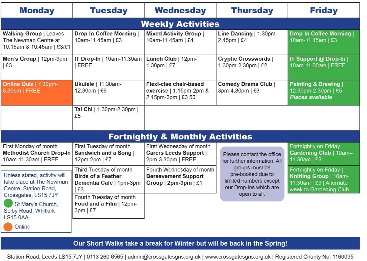 Cross Gates & District Good Neighbours’ Scheme CIO have released their upcoming events and activities. These sessions are aimed at people who are over 60 and live in the Crossgates area. To find out more, please visit https://crossgatesgns.org.uk or to book please call 0113 260 6565.